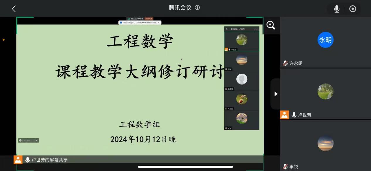 为提升教学质量,规范教学大纲,使得工程数学系列课程的教学工作顺利展开,伟德国际1946数理部工程数学课程组,于2024年10月12日晚8点召开了线上教学大纲修订研讨会。本次会议由课程组组长卢世芳教授主持,数理部主任李锐,副主任王培颖副教授,高凌云教授应邀参加了研讨会。工程数学课程组全体教师参会,旨在集思广益,通过对现有的教学大纲进行全面梳理和优化,规范大纲的内容与格式,提升教学质量与员工学习成效,使得人才培养计划顺利展开。