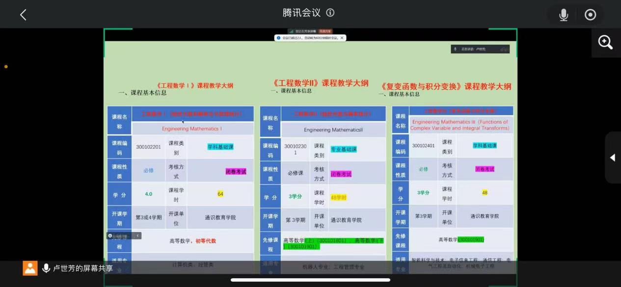 高凌云教授、李锐主任与王培颖主任就大纲编写的重要性及其中的用语规范等提出了指导性意见,围绕着工程数学的三个课程的基本信息:如课程类别、先修课程等发表了自己的建议。王彦华老师对课程大纲中的具体内容:如课程目标、毕业要求分解指标点、教学重难点、考核方式等给出了具体的修订建议。使得教学大纲更能够支撑教学本身,确保了教学大纲的规范性与指导性。