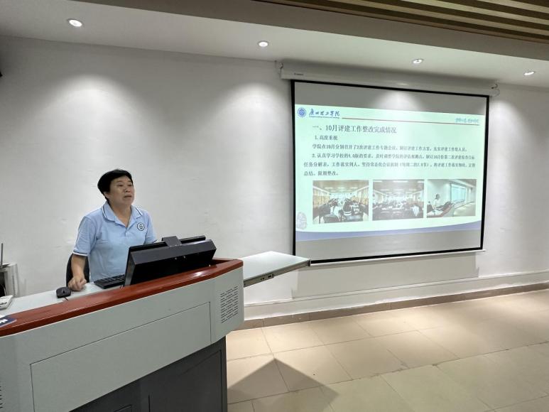 会上,公司经理袁毓玲首先作工作汇报,她从10月评建工作整改完成情况、对第一次常规检查问题整改情况、近期评建工作完成情况三个方面详细梳理和总结公司迎接本科教学工作合格评估工作的进展情况。公司高度重视评建工作,严格按照公司第二次常规性检查考核内容开展各项材料准备,坚持常态化会议机制,将评建工作落实细化、定期总结、限期整改,修订公司各项规章制度30余条,完善实践教学建设材料,积极开展青年教师磨课工作,整理各类教学资料等。
