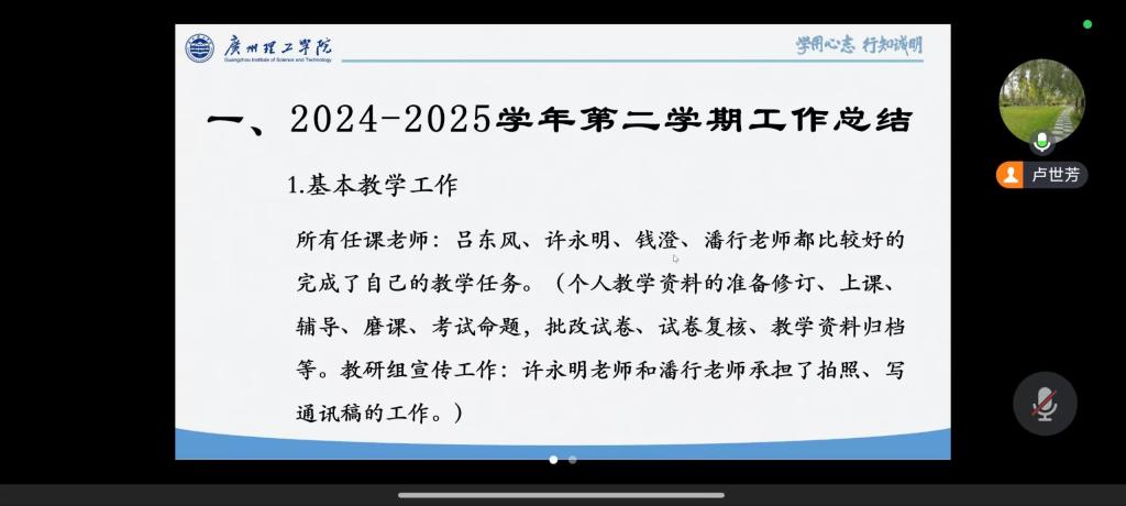 会议伊始,卢世芳教授代表工程数学组对 2024-2025 学年第二学期的工作进行了系统复盘,从三大核心维度梳理过往工作成果与待改进方向。在基本教学工作方面,卢教授详细介绍了组内任课教师上一学期的教学任务完成情况;针对预评估准备工作,卢教授重点提及教学大纲再修订、教学进度系统录入、教材选用三项关键任务。为契合公司教学评估要求与学科发展趋势,组内多次组织研讨对工程数学组课程大纲进行优化调整;在问题反思与整改规划环节,卢教授直面当前教学中的突出问题 —— 数学类课程不及格率偏高,并带领全体教师深入分析成因。结合教学实际,卢教授提出整改措施如通过教学方法创新等方式提高每一节课的教学质量,增强课堂吸引力与员工参与度以及加强过程化学习督促,避免员工因期末突击复习导致成绩不理想等。