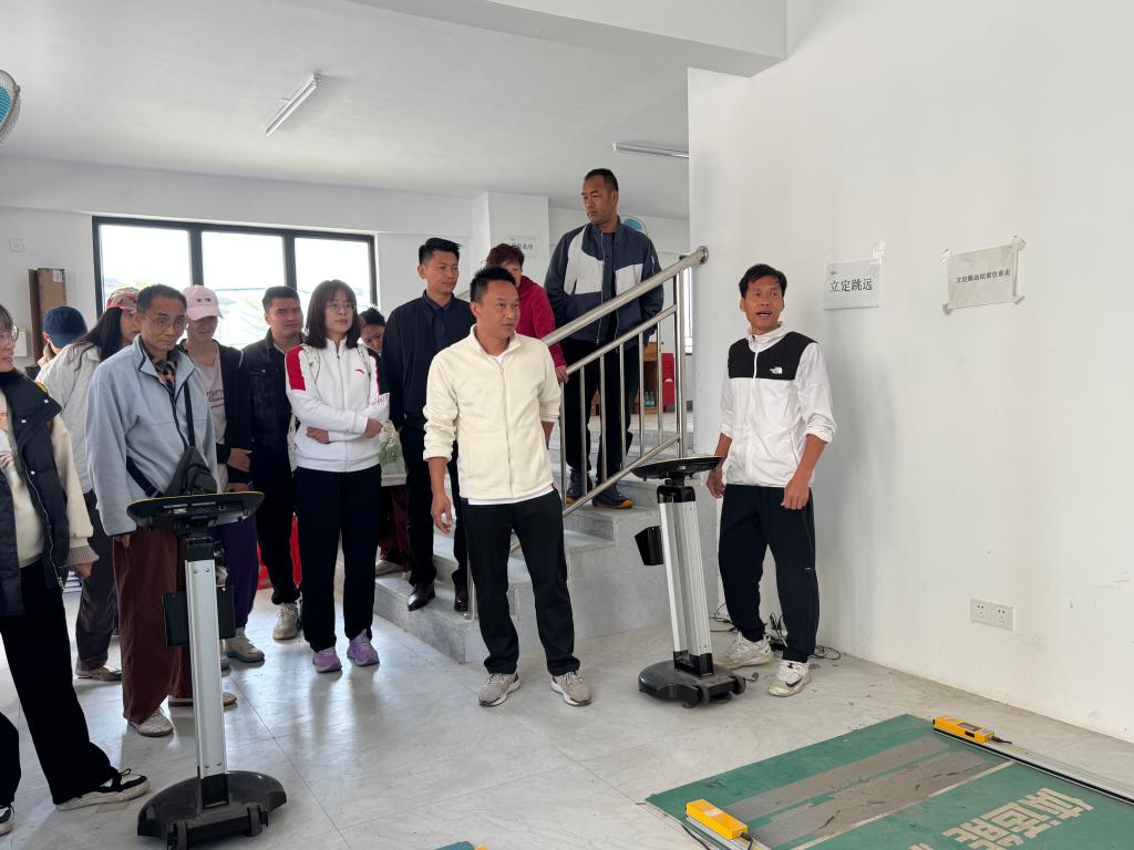 随后,培训进入核心环节——体测器材操作培训。陈堪富主任详细讲解引体向上测试仪、立定跳远测试仪等体测器材的正确操作方法。在立定跳远电子测量仪操作培训中,展示了如何精准识别员工起跳、落地位置,避免误判,以及数据的快速准确记录,确保教师能够熟练运用设备,为员工提供公平、准确的测试环境。